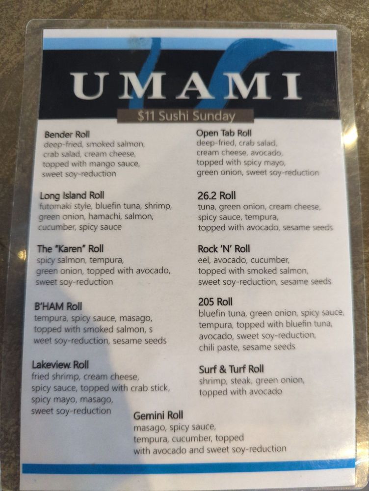 Umami Bham is a trendy and classy Thai-Sushi Bar located in Birmingham, AL. The menu offers a variety of delicious dishes that cater to different tastes and preferences. From hot bites like Baked Crab Avocado and Chicken Gyoza, to soup & salad options such as Ahi Tuna & Brussel Sprouts Salad and Spicy Coconut Soup, there is something for everyone to enjoy. The hot plates section features dishes like Beef Bulgogi and Mie Goreng, showcasing the flavors and creativity of Umami Bham's culinary offerings. The restaurant provides a hipster and casual ambiance, perfect for dinner gatherings with friends or family. With amenities like waiter service, outdoor seating, and free Wi-Fi, Umami Bham ensures a comfortable and enjoyable dining experience for all customers.